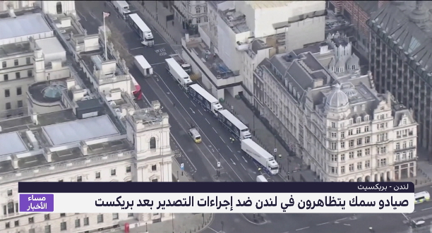 وقفت عشرات شاحنات معبأة بالمحار على طرق بالقرب من داونينج ستريت وسط لندن إثر المشاكل التي تواجه تصدير الأسماك إلى الاتحاد الأوروبي بعد خروج بريطانيا من الاتحاد الأوروبي.