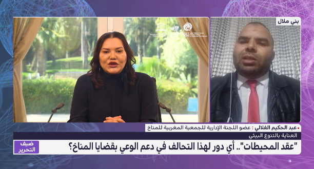 تستضيف فقرة "ضيف التحرير" الأستاذ عبد الحكيم الفلالي، أستاذ التعليم العالي مساعد بجامعة مولاي سليمان ببني ملال والكلية المتعددة التخصصات، وعضو اللجنة الإدارية للجمعية المغربي للمناخ، للحديث عن انضمام مؤسسة محمد السادس لحماية البيئة إلى تحالف عقد علوم المحيطات كعضو مؤسس، حيث يشكل هذا التحالف الذي ترعاه الأميرة للا حسناء رئيسة ”مؤسسة محمد السادس لحماية البيئة” ثمرة تعاون مكثف بين المؤسسة ومنظمة اليونسكو والتزاما ملكيا بقضايا المناخ والبيئة.