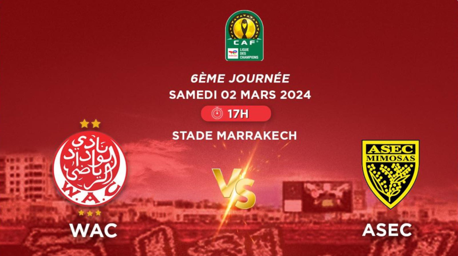 يستضيف الوداد الرياضي، غدا السبت بالمركب الكبير بمراكش، فريق أسيك ميموزا الإيفواري، برسم الجولة السادسة والأخيرة من مباريات المجموعة الثانية لدوري أبطال إفريقيا لكرة القدم، تحت شعار الانتصار وانتظار نتيجة مباراة ملعب دار السلام بتنزانيا لانتزاع تذكرة العبور للدور ربع النهائي.