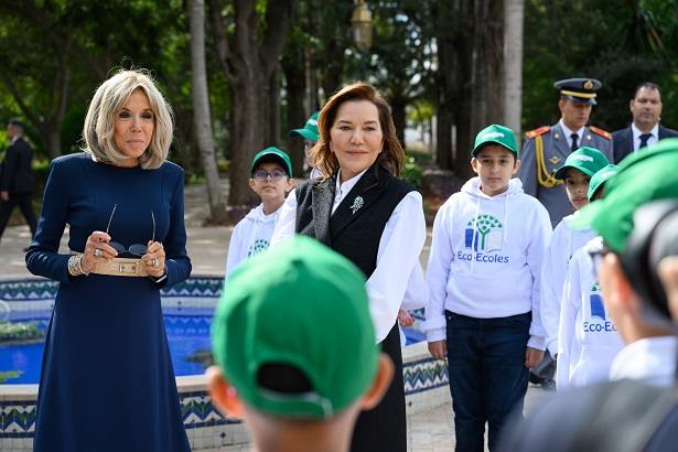 بعد ذلك، تقدم للسلام على صاحبة السمو الملكي الأميرة للا حسناء والسيدة بريجيت ماكرون تلاميذ بالمدارس البيئية، قبل القيام بزيارة لحديقة التجارب النباتية.