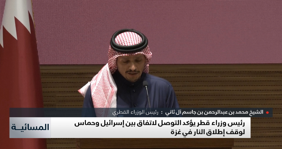 أعلن رئيس مجلس الوزراء وزير الخارجية القطري الشيخ محمد بن عبد الرحمن آل ثاني، عن التوصل لاتفاق يشأن وقف إطلاق النار في غزة.