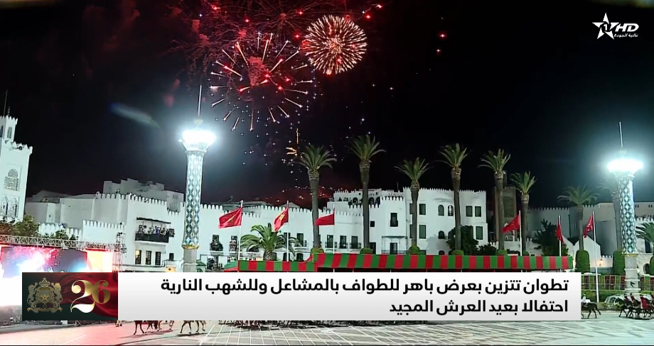 ازدان شارع محمد الخامس بتطوان، مساء الأربعاء، بعرض بديع للطواف بالمشاعل، فيما أضاءت الشهب النارية سماء مدينة الحمامة البيضاء، على أنغام وإيقاعات الجوق السيموفوني الملكي، احتفاء بالذكرى السادسة والعشرين لتربع صاحب الجلالة الملك محمد السادس على عرش أسلافه الميامين.