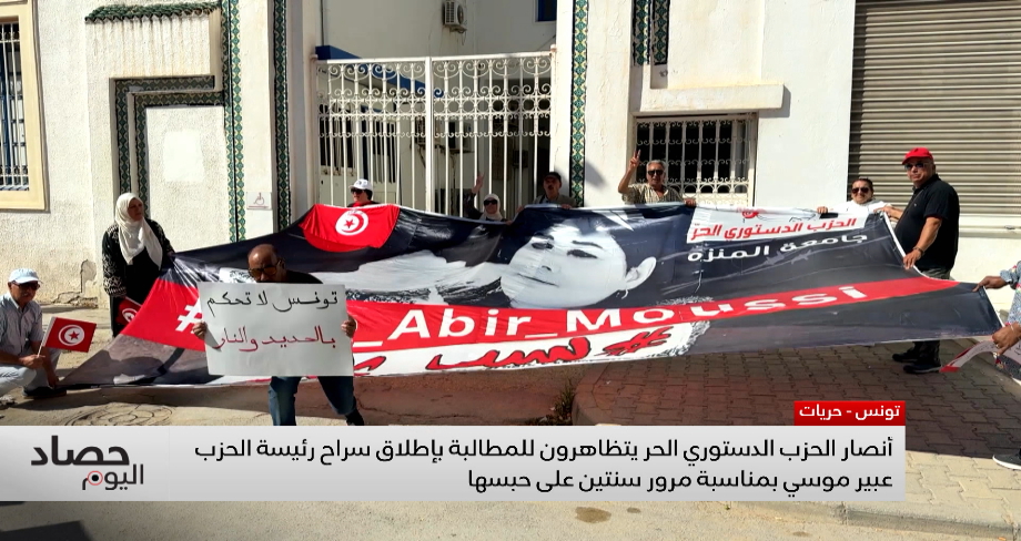 في تونس تظاهر أنصار الحزب الدستوري الحر امام مقر البرلمان للمطالبة بإطلاق سراح رئيسة الحزب عبير موسي بمناسبة مرور سنتين على حبسها.