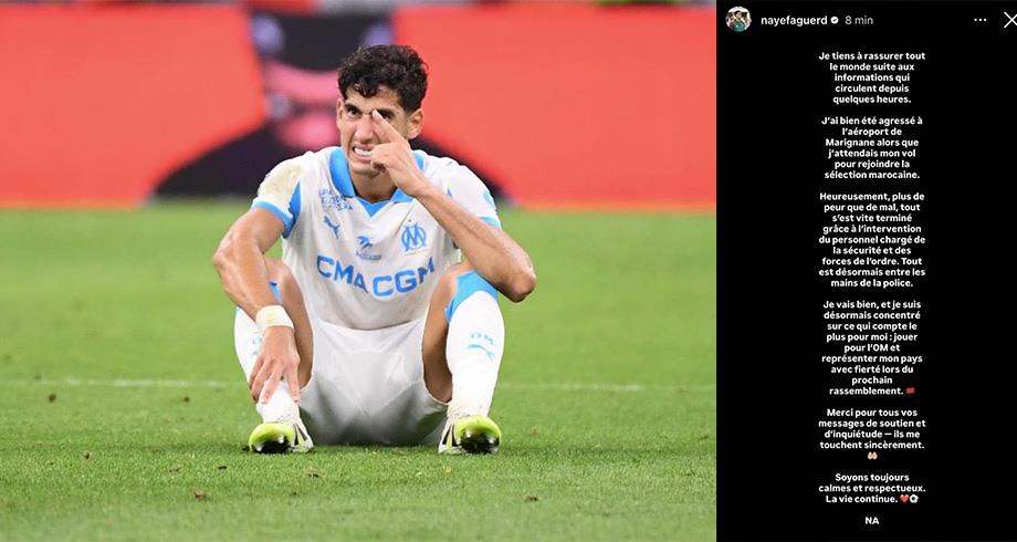 "أود أن أطمئن الجميع بعد الأخبار التي تم تداولها خلال الساعات الماضية. بالفعل، تعرضت لاعتداء في مطار مارينيان أثناء انتظاري الرحلة المتجهة نحو المغرب. لحسن الحظ، لم يتطور الأمر، وتمت السيطرة على الموقف بسرعة بفضل تدخل الأمن والشرطة. أنا بخير الآن، وأركز تماما على ما هو أهم بالنسبة لي: اللعب مع أولمبيك مرسيليا وتمثيل بلدي بفخر خلال المعسكر القادم. شكراً لكل من أرسل لي رسائل دعم واهتمام، لقد تأثرت بها كثيراً. لنبقَ دائما هادئين ومحترمين، فالحياة مستمرة."