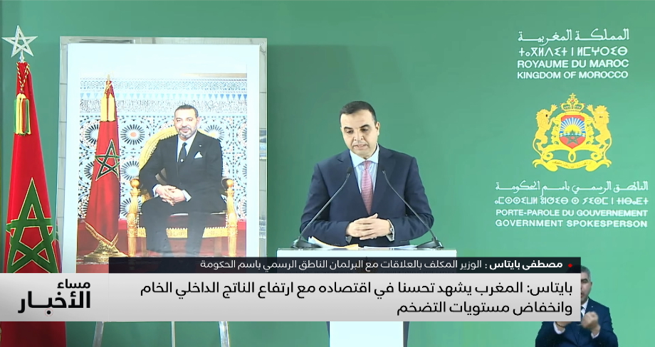 أكد الناطق الرسمي باسم الحكومة مصطفى بايتاس أن الاجراءات التي اتخذتها الحكومة والسياساتِ الحكومية جعلت أداء الاقتصاد المغربي جيدا بالنظر لارتفاع الناتج الداخلي الخام، وانخفاضِ مستوياتِ التضخم.
