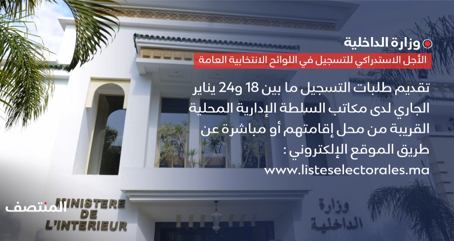 في إطار عملية المراجعة السنوية للوائح الانتخابية العامة الجارية حاليا، أفاد وزير الداخلية بأن المواطنات والمواطنين، غير المسجلين لحد الآن في اللوائح المذكورة، الذين تتوفر فيهم الشروط المطلوبة قانونا، والبالغين من العمر 18 سنة كاملة على الأقل أو الذين سيبلغون هذا السن في 31 مارس 2026، يتعين عليهم تقديمُ طلبات تسجيلهم، خلال الفترة ما بين 18 و24 يناير الجاري، لدى مكاتب السلطة الإدارية المحلية القريبة من محل إقامتهم أو مباشرة عن طريق الموقع الإلكتروني لوزارة الداخلية.