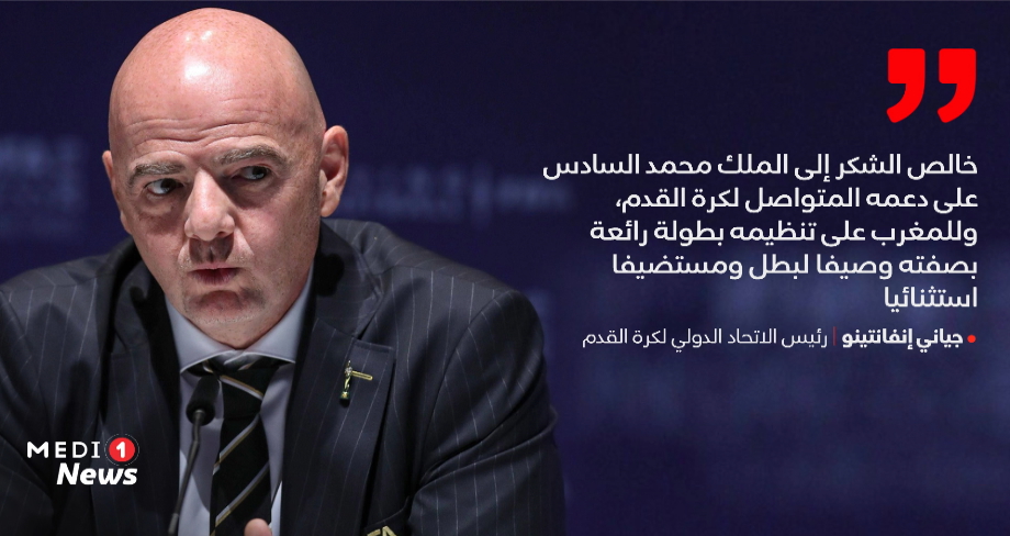 وفي بيان نشر على شبكات التواصل الاجتماعي، تقدم إنفانتينو بخالص الشكر إلى الملك محمد السادس على دعمه المتواصل لكرة القدم، كما هنأ للمغرب على تنظيمه بطولة رائعة، بصفته، في الوقت نفسه، وصيفا للبطل، ومستضيفا استثنائيا.