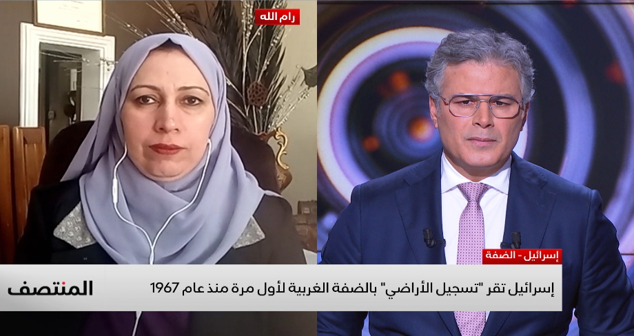 إسرائيل تقر "تسجيل الأراضي" بالضفة الغربية لأول مرة منذ عام 1967 .. قراءة تمارا حداد الإثنين 16 فبراير 2026 - 12:59 إسرائيل تقر "تسجيل الأراضي" بالضفة الغربية لأول مرة منذ عام 1967 .. قراءة تمارا حداد، أكاديمية ومحللة سياسية.