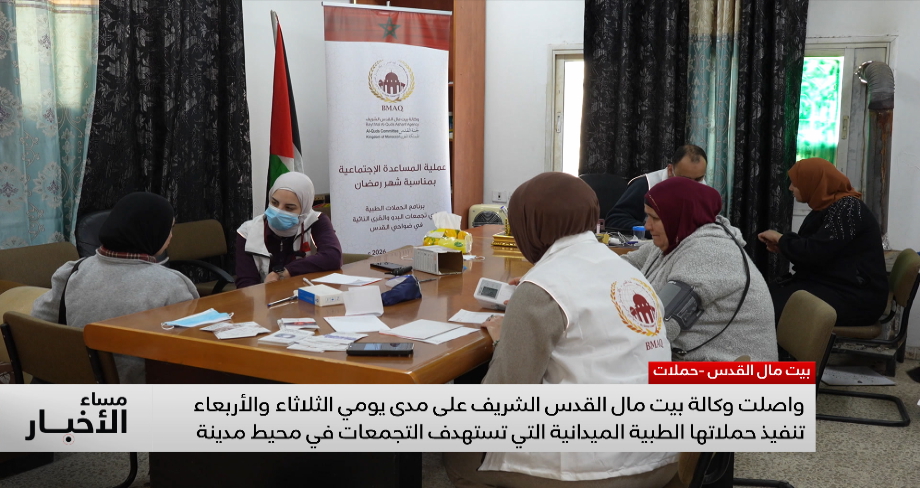 حملات طبية لوكالة بيت مال القدس الشريف لدعم صمود المقدسيين نظمت وكالة بيت مال القدسِ الشريف حملات طبية في قرى بعيدة ومعزولة تجمع فيها عشرات الأهالي منذ ساعات الصباح بانتظار دورِهم لإجراءِ الفحوصات الطبية أو استشارة الأطباء.