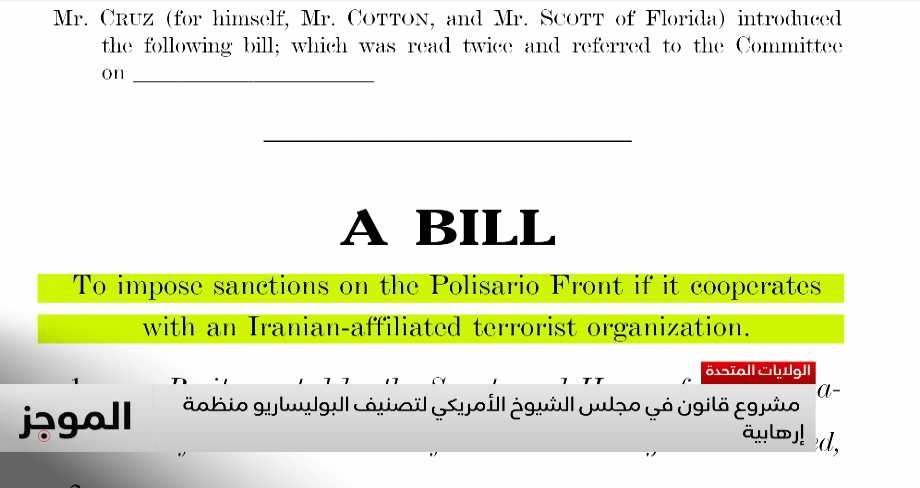 قدم ثلاثة من أعضاء مجلس الشيوخ الأمريكي، وهم تيد كروز وتوم كوتون وريك سكوت، أمس مشروع قانون يهدف إلى إطلاق عملية تصنيف جبهة البوليساريو منظمةً إرهابية، استنادًا إلى اتهامات بوجود روابط بينها وبين شبكات مدعومة من إيران.