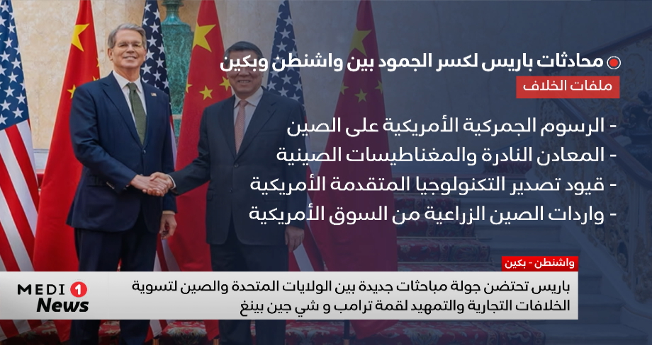 احتضنت العاصمة الفرنسية باريس، الأحد، جولة جديدة من المحادثات بين واشنطن وبكين وذلك بهدف تسوية الخلافات التجارية، والتمهيد لقمة مرتقبة بين الرئيس الأمريكي دونالد ترامب ونظيره الصيني شي جين بينغ نهاية الشهر الجاري.