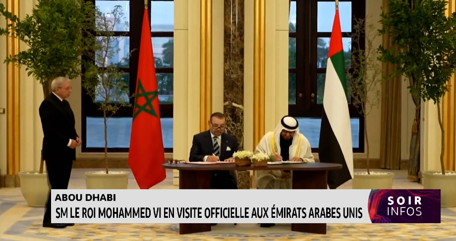 Zoom sur la visite officielle que Sa Majesté le Roi Mohammed VI a entamé ce lundi aux ֥Émirats arabes unies. Un accueil officiel a été réservé, au Palais présidentiel à Abou Dhabi, au souverain par Cheikh Mohammed Ben Zayed Al-Nahyane, Président de l'Etat des Emirats Arabes Unis. Les 2 chefs d'Etat ont eu des entretiens en tête-à-tête et ont présidé la cérémonie d'échange de plusieurs mémorandums d'entente entre les deux pays. Les détails avec Alae Bennani