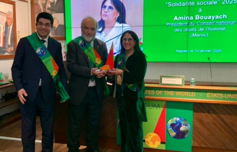 La présidente du Conseil national des droits de l'Homme (CNDH), Amina Bouayach a reçu, vendredi à Naples, en Italie, le Prix de la Fondation Méditerranée 2025, et s'est faite "Ambassadrice de la Fondation États-Unis du Monde" pour "sa riche et indéniable contribution en matière de défense des droits humains".