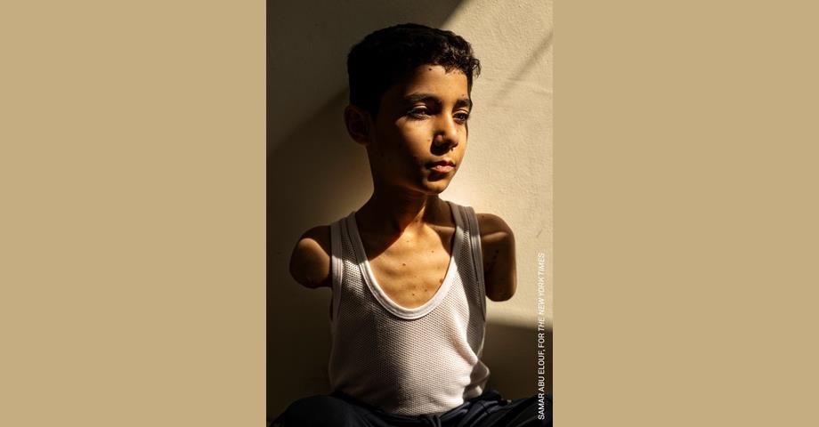 La photo représente un garçon palestinien de 9 ans, qui a perdu ses deux bras alors qu'il fuyait une attaque israélienne à Gaza. Il s'agit de Mahmoud Ajjour, évacué à Doha après qu'une explosion lui a arraché un bras et mutilé l'autre l'année dernière.